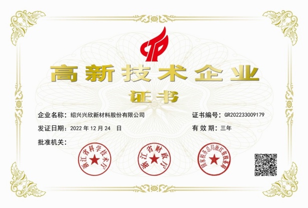 紹興興欣新材料股份有限公司成立于2002年06月27日,占地面積122畝,位于杭州灣上虞經(jīng)濟(jì)技術(shù)開發(fā)區(qū)拓展路2號,現(xiàn)有職工200余人,專業(yè)技術(shù)人員50余人;博士、碩士研究生30余人組成的一支知識型、專業(yè)化的技術(shù)科研團(tuán)隊(duì)。公司面向全球市場,專業(yè)開發(fā)電子化學(xué)品、環(huán)?;瘜W(xué)品、醫(yī)藥中間體、高分子材料等先進(jìn)新材料重點(diǎn)領(lǐng)域的省級科技型企業(yè);建有浙江上虞、安徽東至兩個(gè)生產(chǎn)基地。目前為“國家高新技術(shù)企業(yè)”、浙江省“隱形冠軍”企業(yè)、浙江省專精特新中小企業(yè);建有“省級”研究開發(fā)中心,共建天津大學(xué)浙江紹興研究院電子化學(xué)品研發(fā)中心。